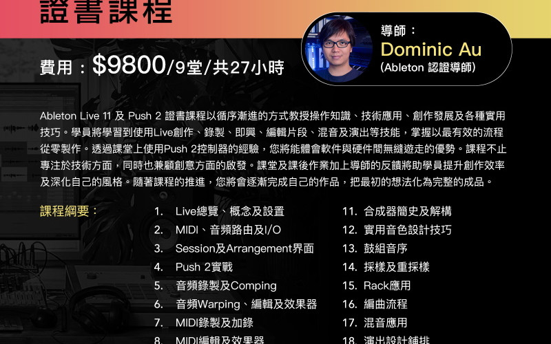 好高興可以同香港唯一一間 Ableton Certified Training Center @themediaprohk 合作搞 @ableton 課程!十一月會開證書課程同拆開既初中高階課程,有興趣既朋友可以去佢地 IG 或網站睇課程資料!